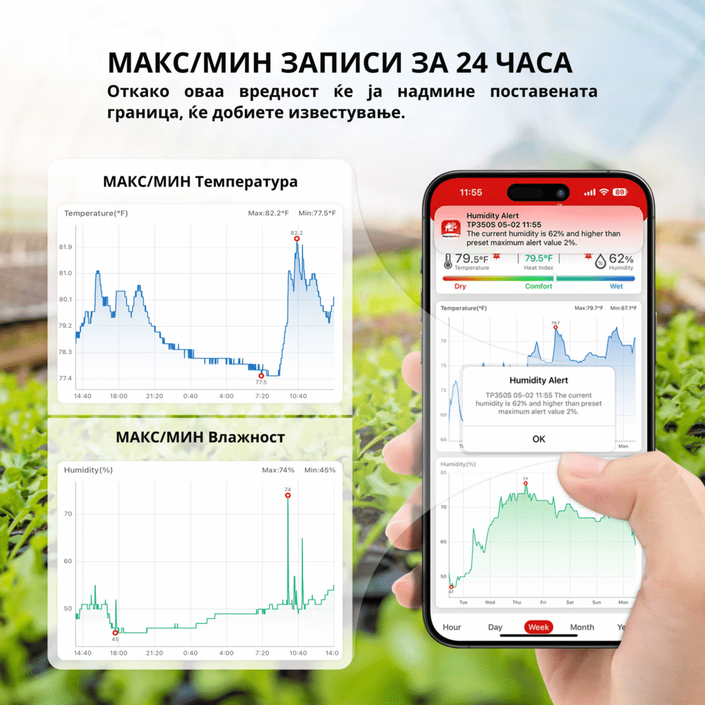 - Висока прецизност: ±1°F за температура и ±2–3% RH за влажност