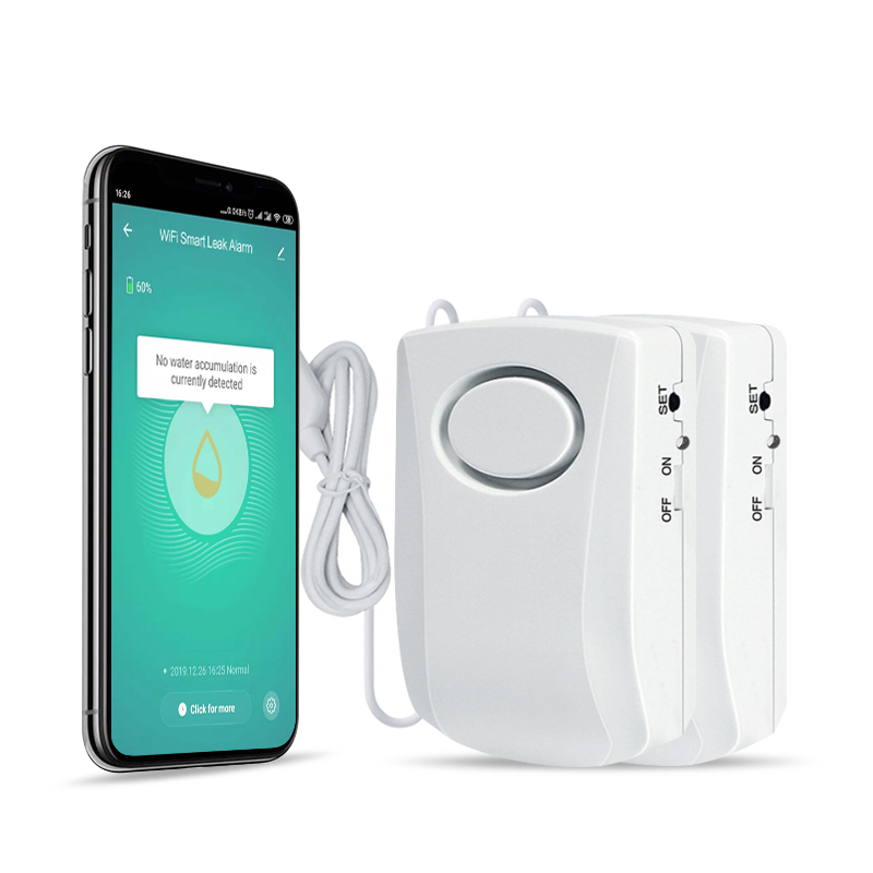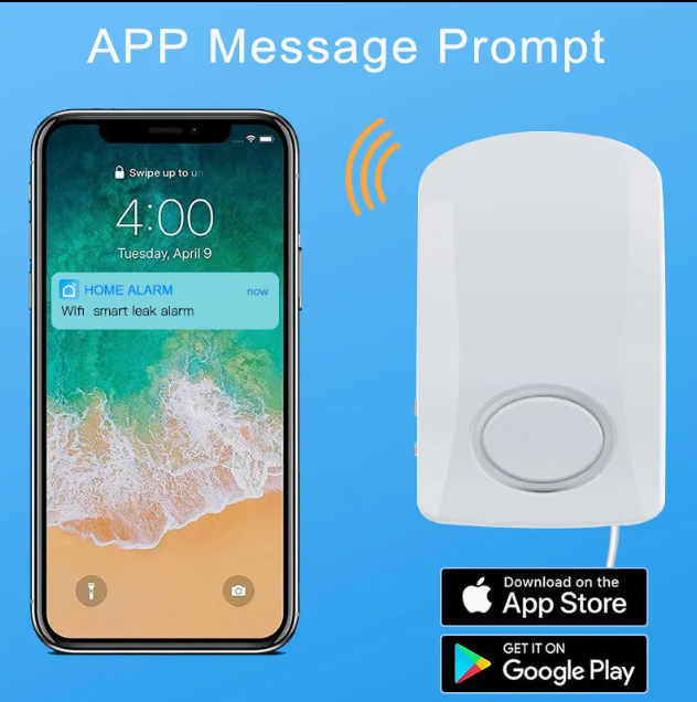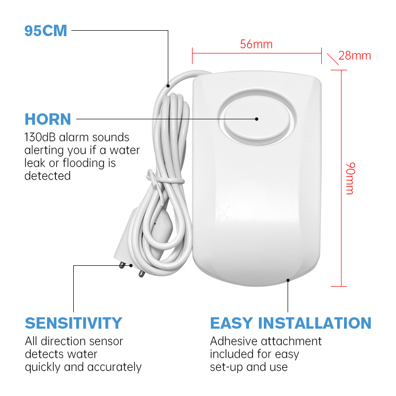 Моментална детекција – веднаш штом сензорот дојде во додир со вода, активира аларм од 130 dB и испраќа push известување на вашиот телефон, без разлика дали сте дома или надвор.